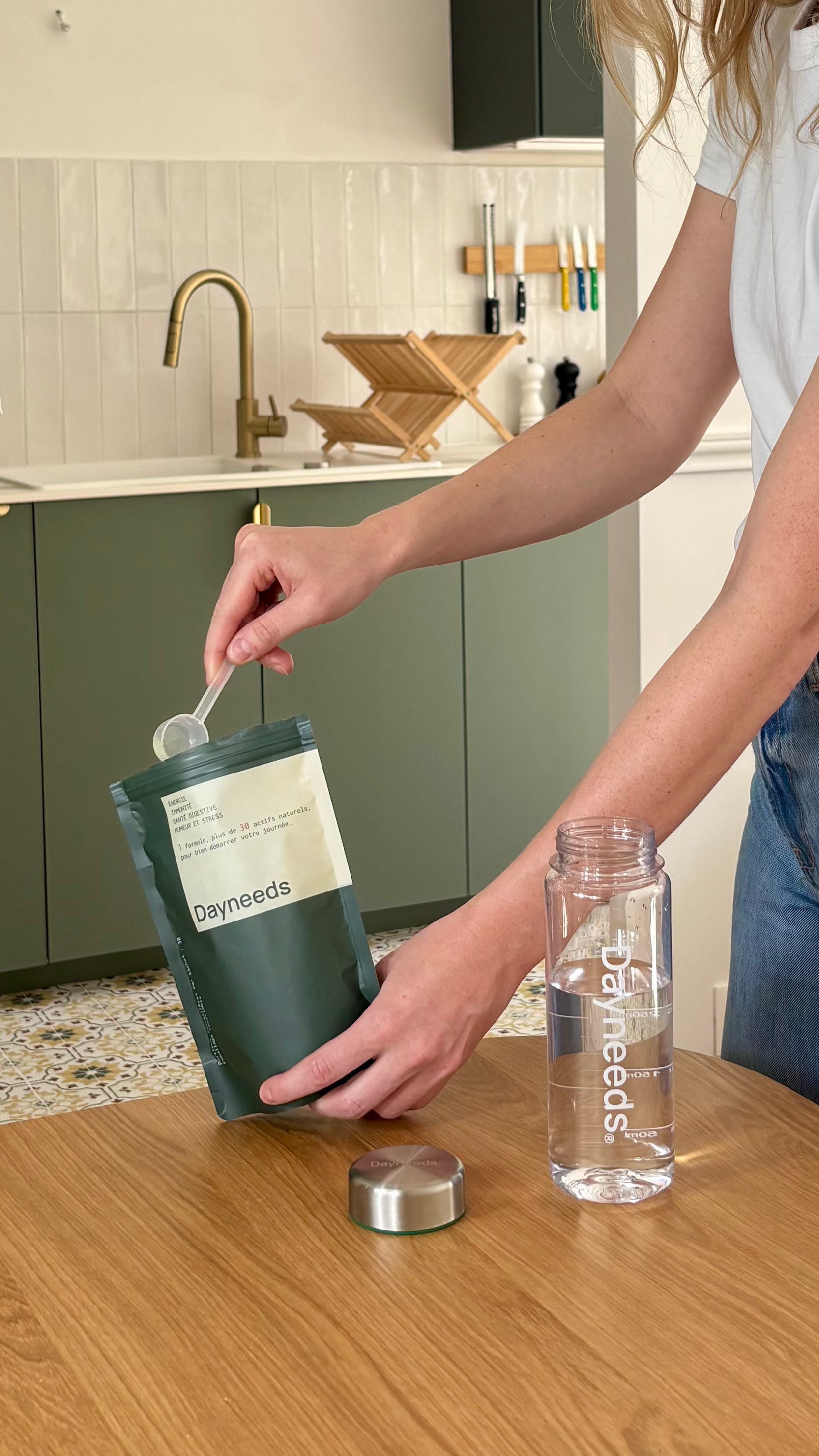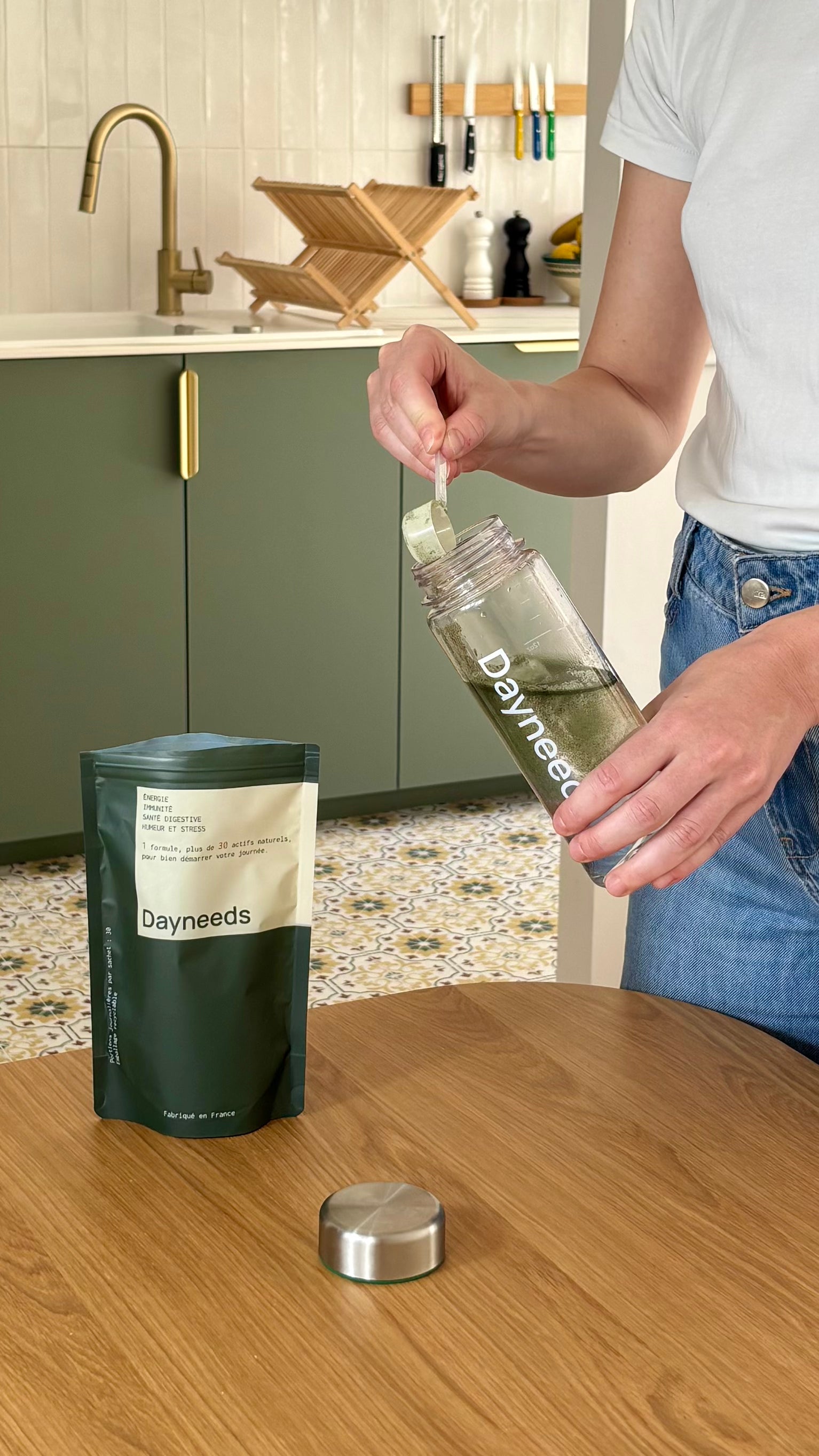 Nous recommandons de prendre Dayneeds le matin, à jeun, pour maximiser l’absorption des nutriments qu'il procure. Mélangez une dose (l’équivalent d'une cuillère doseuse de 5 grammes, fournie à l'intérieur du sachet) dans 200 à 300 ml d’eau froide, selon votre préférence. Secouez et savourez ! Dayneeds vous apporte simplement l'équivalent des bienfaits de nombreux compléments alimentaires, sans avoir à prendre de multiples gélules ou comprimés. De plus, notre bouteille réutilisable est idéale pour préparer votre mélange en un clin d’œil.